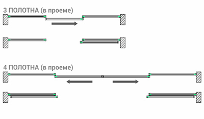 2) В системе из 3 или 4 полотен, полотна размещаются на двух направляющих, расположенных параллельно друг другу. Два крайних полотна располагаются позади и примыкают к стене, полотна являются стационарными и не движутся. Центральные полотна находятся в первом ряду конструкции, движение полотен происходит в направлении стационарных полотен от центра проема. Доводчик расположен только в активных полотнах.