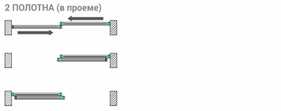 1) В системе из 2 полотен, полотна располагаются в шахматном порядке, находясь на разных направляющих. Оба полотна двигаются в противоположную сторону от исходного базового положения. Каждое полотно системы имеет двунаправленный доводчик, обеспечивающий плавное закрывание и открывание.